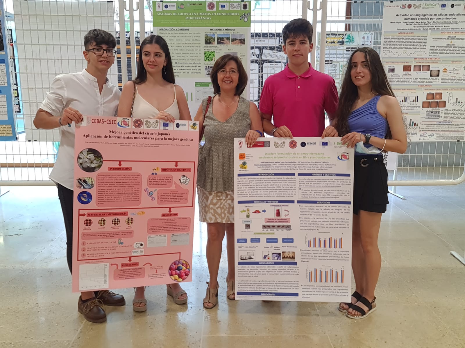 Ambos grupos acompañados de su tutora en los trabajos y profesora de Biología M.ª José Urios Martínez. También asistieron al evento los investigadores del CEBAS y de la Facultad de Veterinaria que colaboraron en los trabajos.