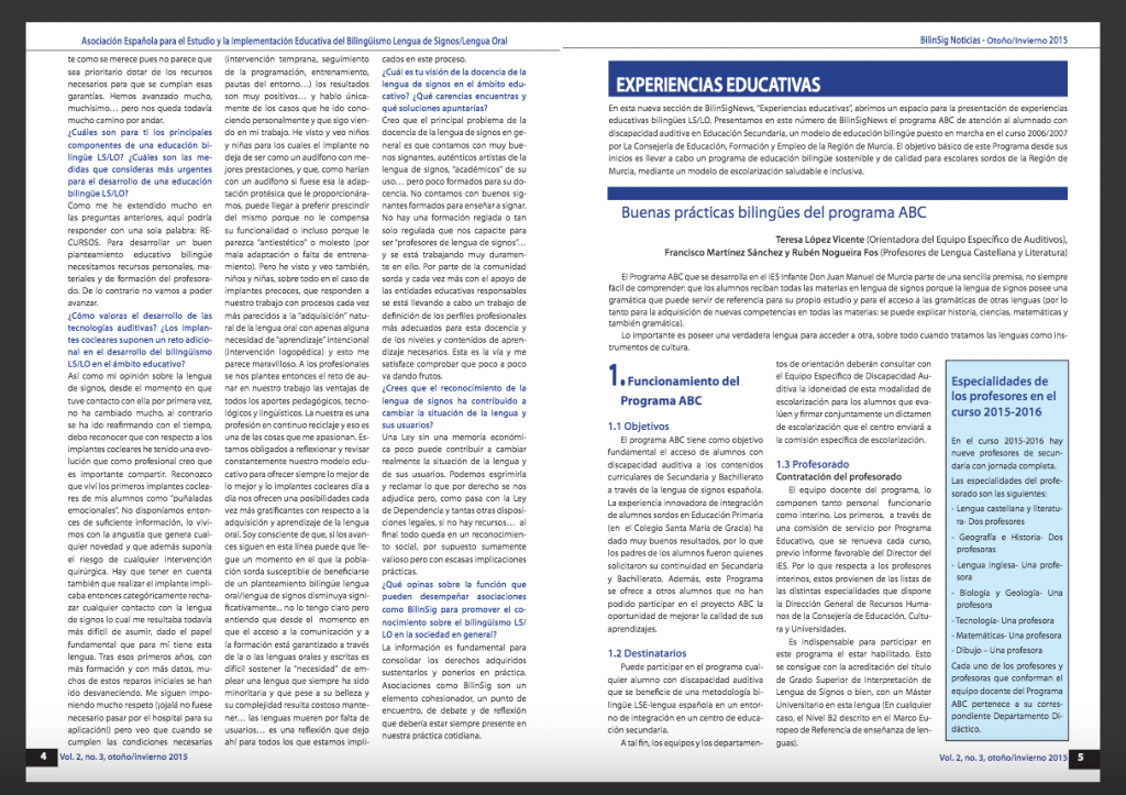La Asociación Española para el Estudio y la Implementación Educativa del Bilingüismo Lengua de Signos/Lengua Oral (BILISIG) ha incluido en su sección, «Experiencias educativas», una reseña del Programa ABC como modelo más inclusivo e igualitario.